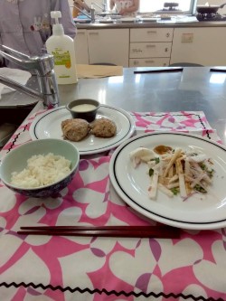 今回の献立は「えのきハンバーグ」「大根サラダ」「杏仁豆腐」です。えのきハンバーグはたねにしっかりと味がついているので、ハンバーグソースを別で作らなくても美味しく仕上がりました。大根サラダにはかいわれ大根ではなく、見た目が似ているベニーナを使い、茎の部分の赤色で彩りが良くなりました。杏仁豆腐は本物の杏仁霜(きょうにんそう)を使った本格派。杏仁とはアーモンドのことです。